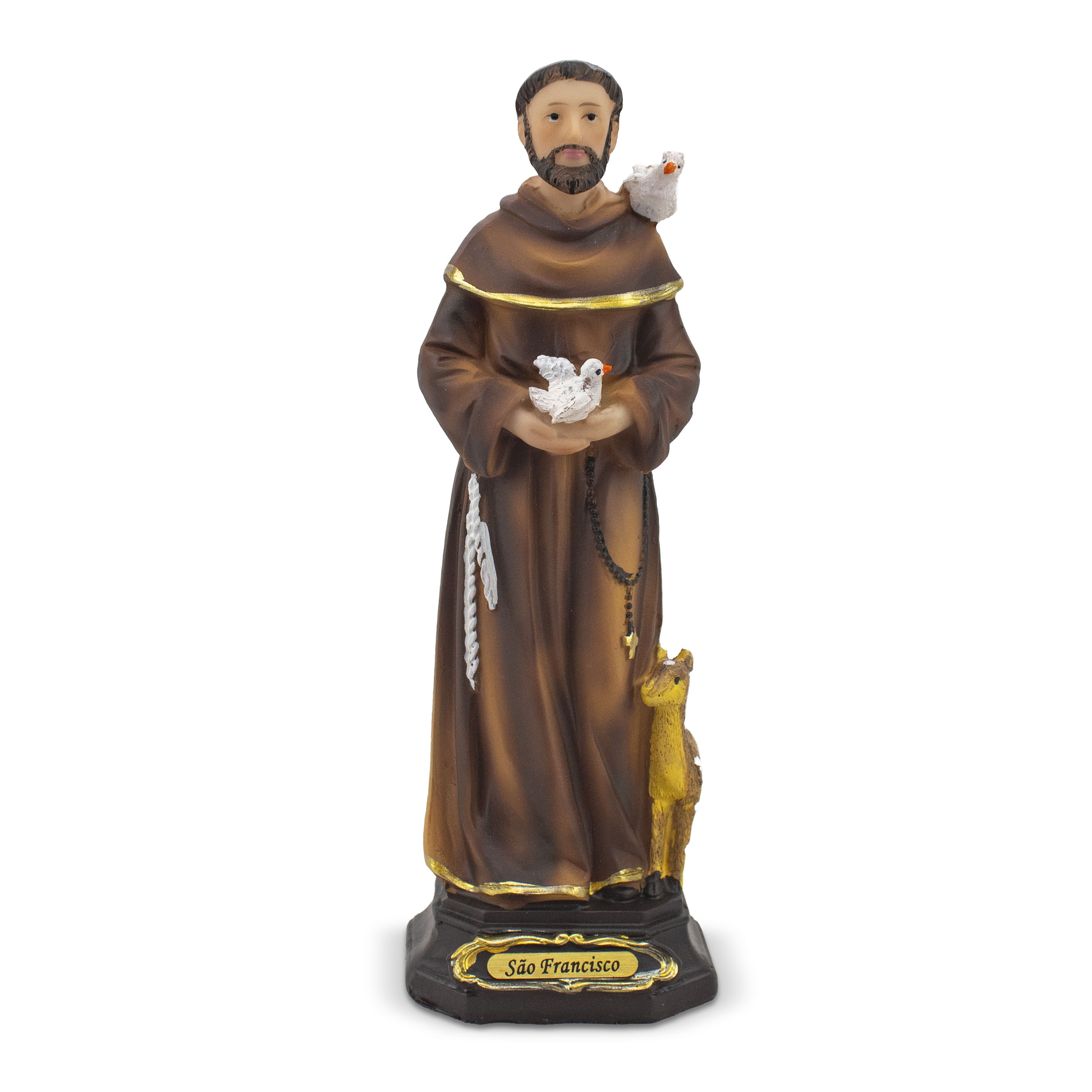 A paz e a simplicidade ganham vida nesta belíssima imagem importada de São Francisco. Esculpida em resina com aproximadamente 19 cm, a peça destaca-se pelos ricos detalhes dourados e o acabamento impecável. Os traços serenos do santo, acolhendo os animais, transmitem imediata proteção e amor à natureza. Uma obra de arte sofisticada, perfeita para abençoar seu lar.